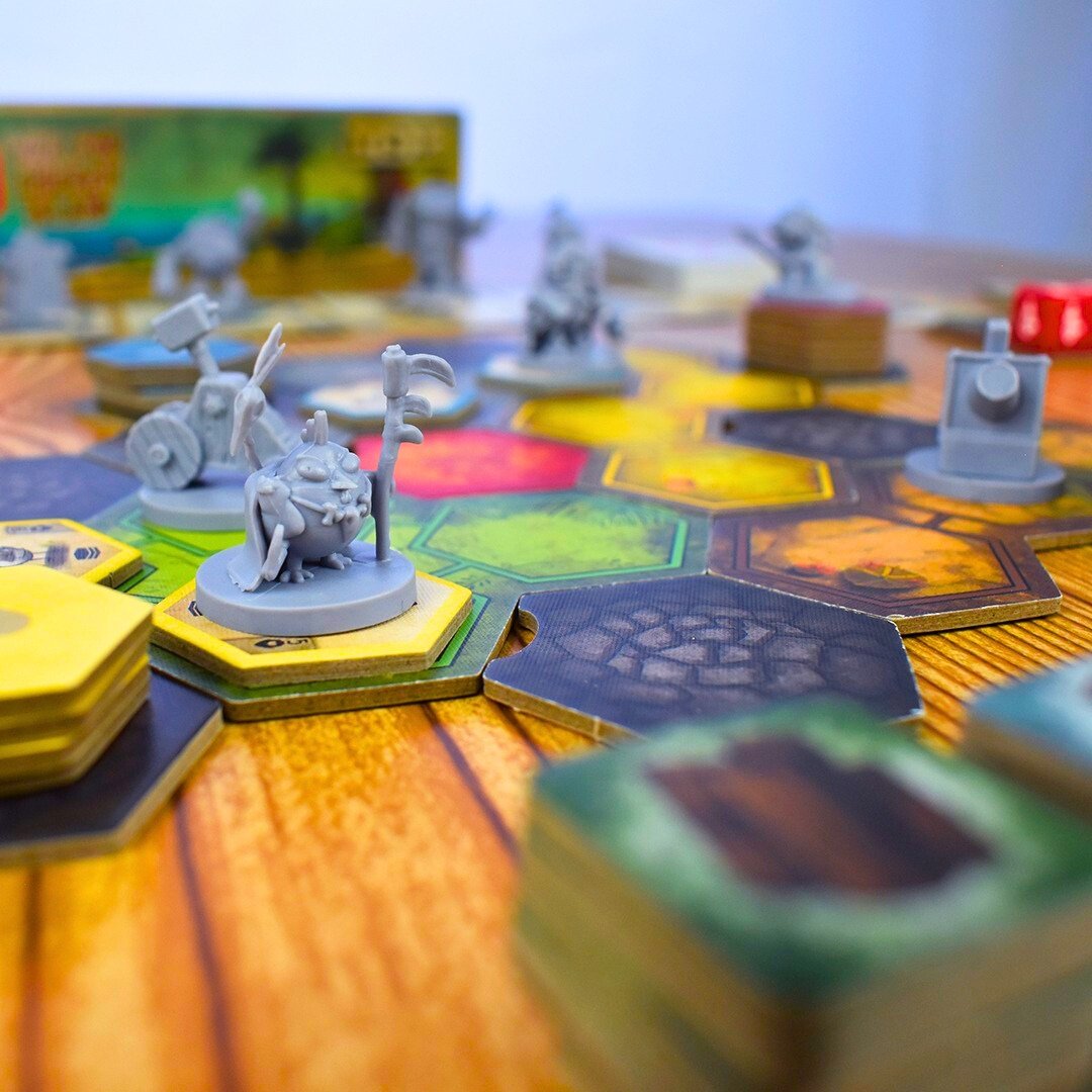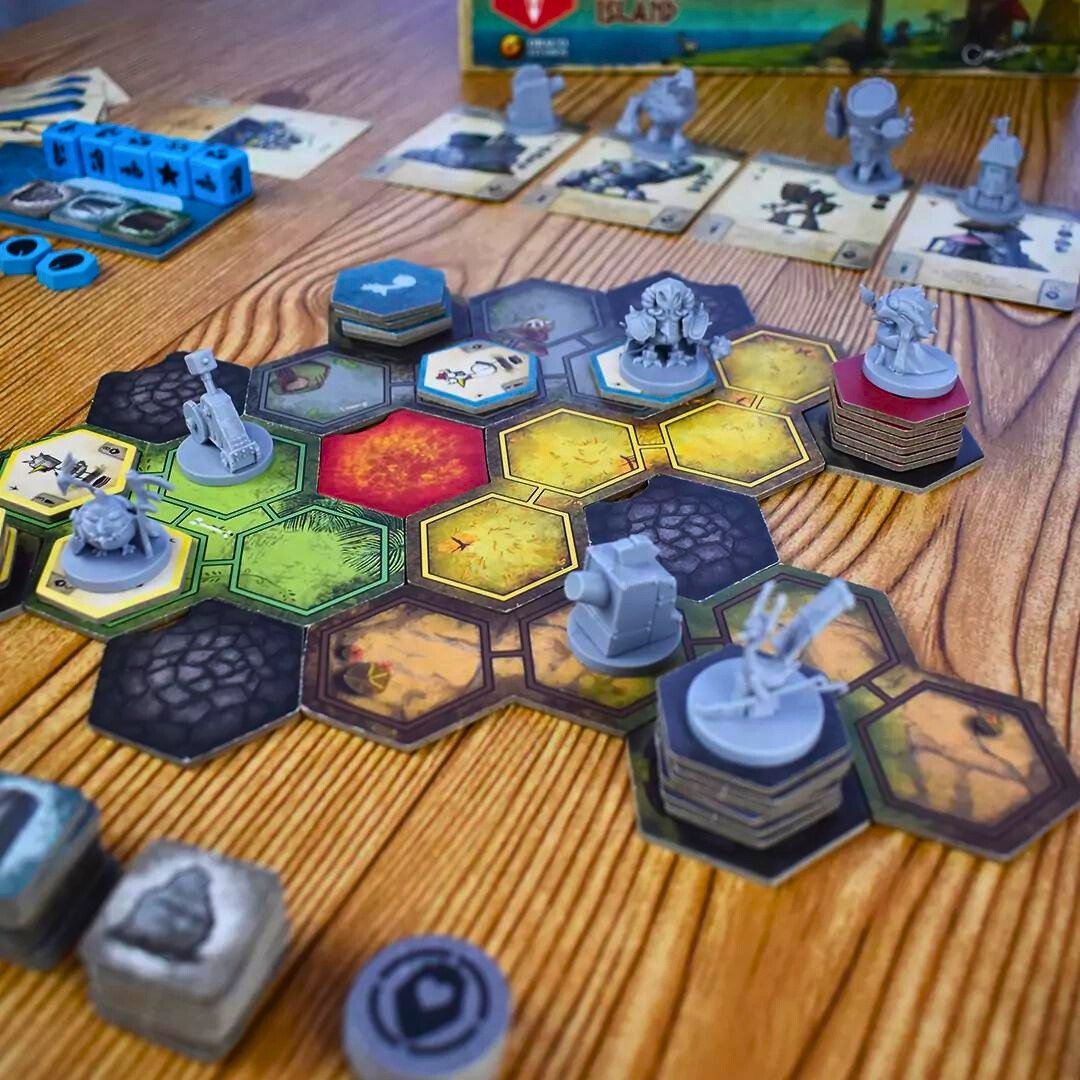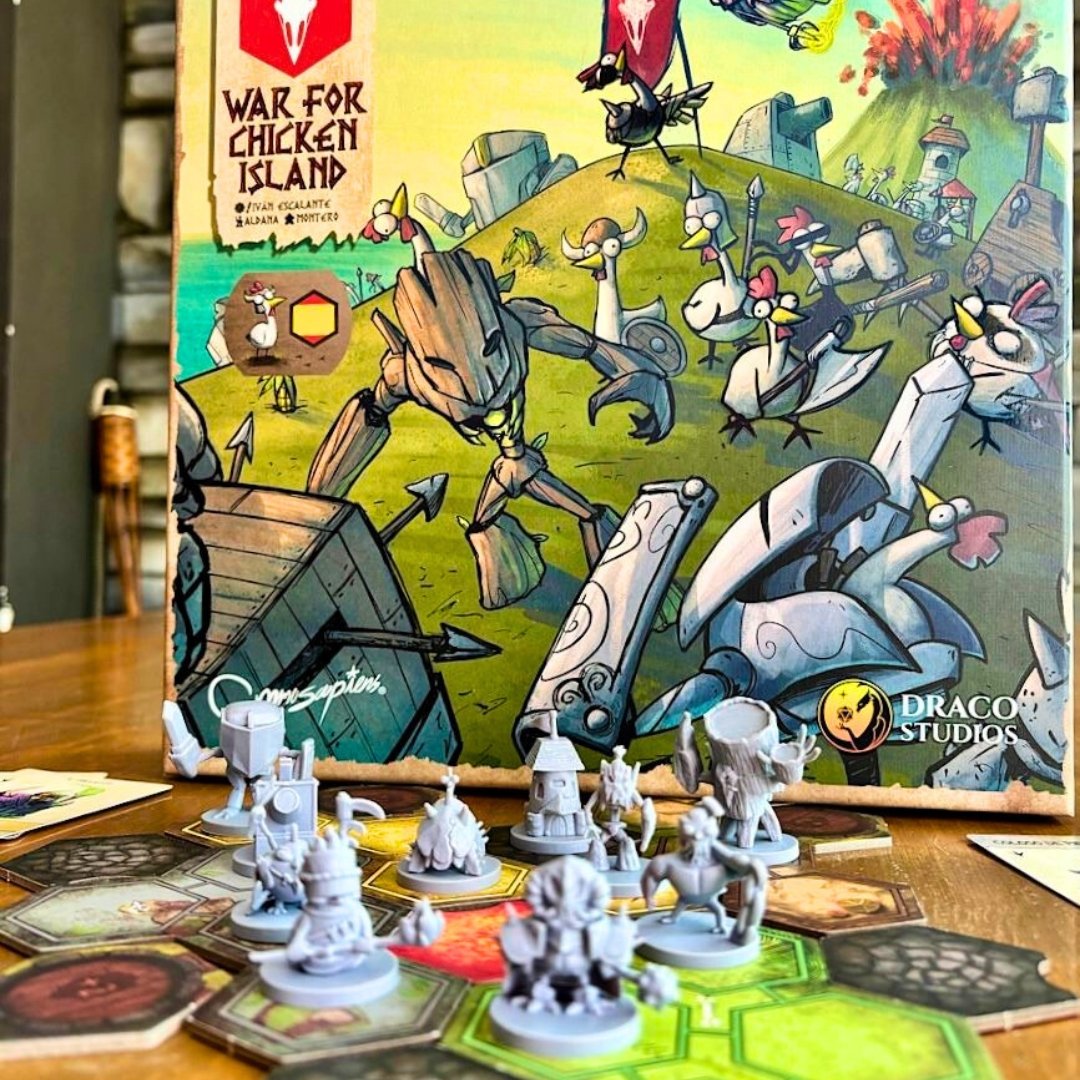War for the Chicken Island es un juego de mesa trepidante donde clanes rivales luchan por dominar una isla repleta de pollos legendarios, recursos escasos y artefactos absurdamente poderosos. ¡Planifica, embosca y contraataca mientras el caos emplumado se desata en cada turno!